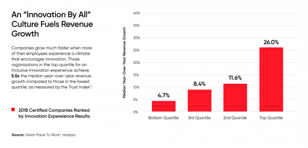 Great Place To Work® araştırmasına göre, organizasyonlar tüm çalışanların inovasyon çalışmalarına dahil olmaya teşvik edildiği ”Innovation by All (Herkes Tarafından Yenilik)” yaklaşımını uyguladıklarında en yüksek inovasyon seviyelerine ulaşıyor. Daha fazla sayıda çalışanın inovasyon süreçlerine dahil edildiğini ve kapsayıcılığın olduğu organizasyonlarda yıllık gelir artışı, çalışanları inovasyon süreçlerine dahil etme puanı daha düşük sonuçlara sahip olan organizasyonlardan beş kat daha fazladır.