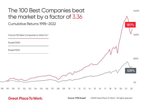 Bir araştırmaya göre, Great Place To Work® En İyi İşverenler™ listelerinde yer alan organizasyonlar, piyasanın geneline kıyasla 3,33 kat daha iyi performans gösteriyor. Bu fark, zaman içerisinde büyüyerek şaşırtıcı bir boyuta ulaşabilir.